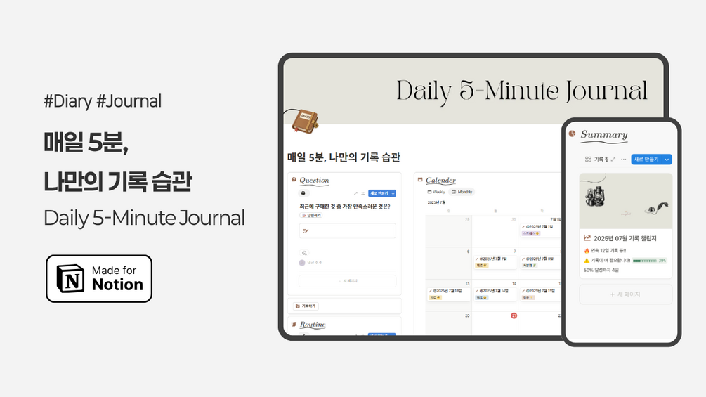 바쁜 일상 속에서도 나만의 소중한 순간들을 놓치지 않도록, 최소한의 기록으로 습관을 만드는 '매일 5분 기록 습관' 템플릿을 소개합니다.